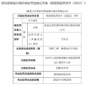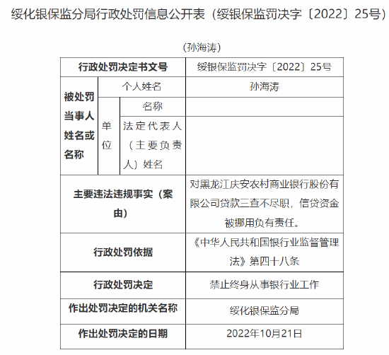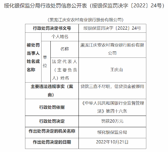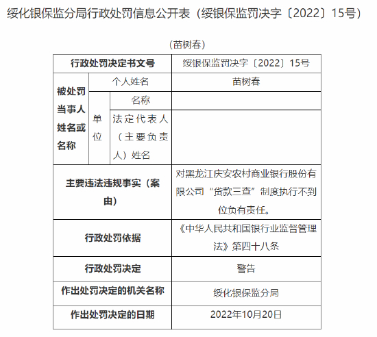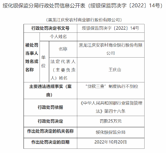 贷款三查不尽职等 黑龙江庆安农商行被罚45万元,一人被终身禁业