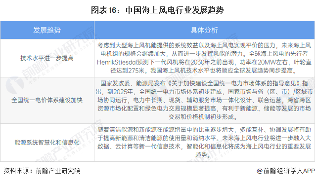 我国海上风电行业未来发展趋势主要有技术水平进一步提高、全国统一电价体系建设加快、能源系统智慧化和信息化三个方向。