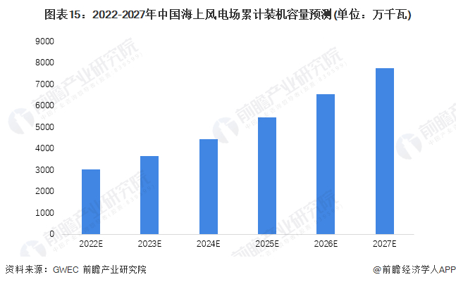 海上风电是可再生能源发展的重要领域之一,具有风资源丰富、可利用小时数高、不占用土地以及适宜大规模开发等特点。结合各省市“十四五”海上风电开发目标与GWEC预测,预计2027年中国海上风电装机容量达到7739万千瓦左右,2022-2027年复合增速20%。