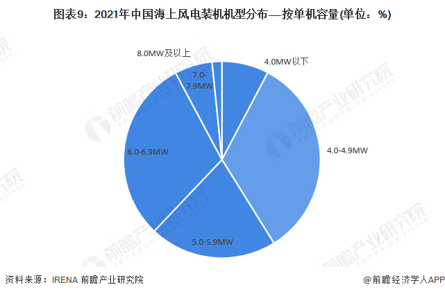 截至2021年年底,我国所有吊装的海上风电机组中,4.0MW(不含4.0MW)以下海上风电机组累计装机容量占全部海上累计装机容量的7.7%,比2020年下降了约10个百分点;4.0-5.0MW(不含5.0MW)机组占比33.4%,比2020年下降了约19个百分点;5.0MW及以上机组占比达到58.8%,比2020年增长了约29个百分点。IRENA数据显示,2021年我国海上风电单机容量平均约为5.7MW,欧洲则达到8.5MW,相较于海上风电发展成熟的欧洲国家,我国海上风电单机容量目前仍然较低。
