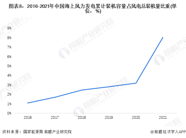 截至2021年,我国海上风电累计装机量占全国风电总装机量比重已达8.0%,海上风电的重要性进一步提高。