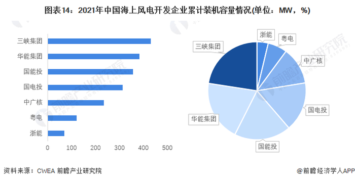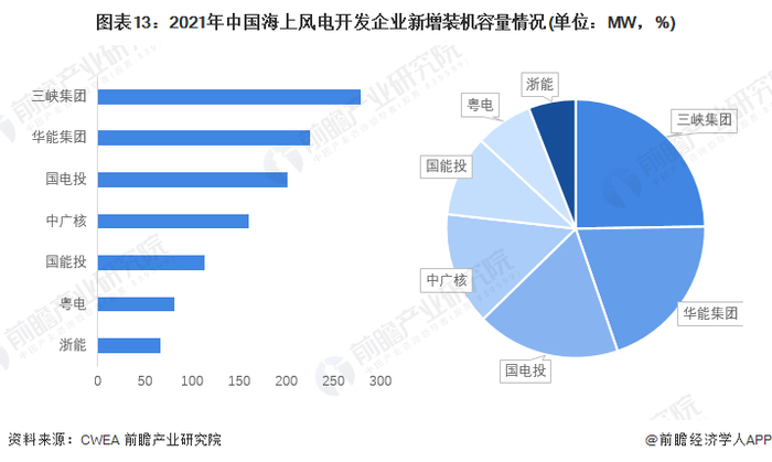 从开发商层面来看,2021年我国共有22家开发企业有海上风电新增装机,其中海上风电新增装机排名5的企业合计占比达到67.7%,前十家新增装机容量合计占比达到87%。