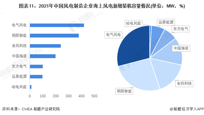 根据全球风能理事会、中国风能专委会等多家组织联合发布的《2021年中国风电吊装容量简报》,2021年我国海上风电新增装机容量最高的风电制造企业为电气风电,达420.4MW,明阳智能和金风科技分别位列第二和第三。