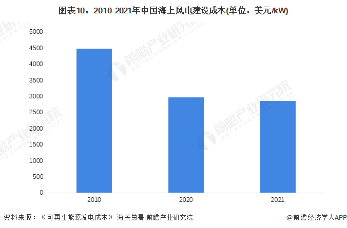 经过多年发展,我国海上风电在技术研发、工程建设和运营等方面取得进步,海上风电项目成本总体呈下降趋势。2020年中国海上风电建设成本约为2968美元/kW,与2010年相比下降33.69%。经初步统计2021年海上风电建设成本进一步下降至2857美元/kW。
