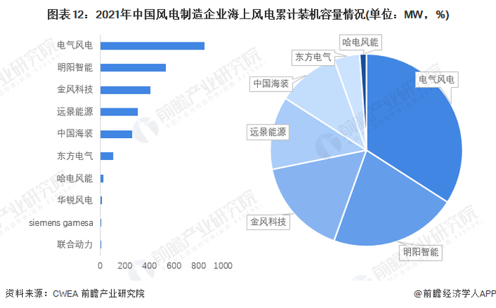 从海上风电累计装机容量来看,截至2021年,我国海上风电制造企业共13家,其中海上风电累计装机容量超过100万千瓦的整机企累计装机量前五为:电气风电、明阳智能、金风科技、远景能源装和中国海装,排名第一的电气风电累计海上风电装机量占我国总装机量比重的34%。