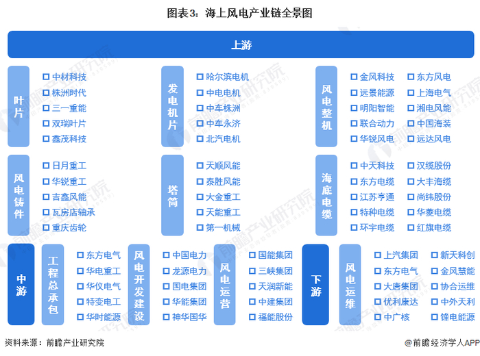 我国海上风电产业链上中下游关键领域代表性企业如下: