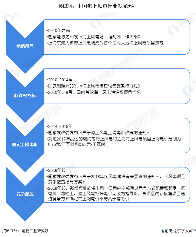 从政策角度来看,我国海上风电共经历了四个阶段历程。从示范项目阶段到特许权招标再到固定上网电价阶段最后到达了竞争配置阶段。2018年5月,国家发改委发布《关于2018年度风电建设有关要求的通知》、《风电项目竞争配置指导方案》;2019年5月,国家发改委发布《关于完善风电上网电价政策的通知》。这些政策都指出“从2019年起,新增核准的海上风电项目应全部通过竞争方式配置和确定上网电价;将陆上、海上风电标杆电价均改为指导价,资源区内新核准项目通过竞争方式确定的上网电价不得高于指导价。”