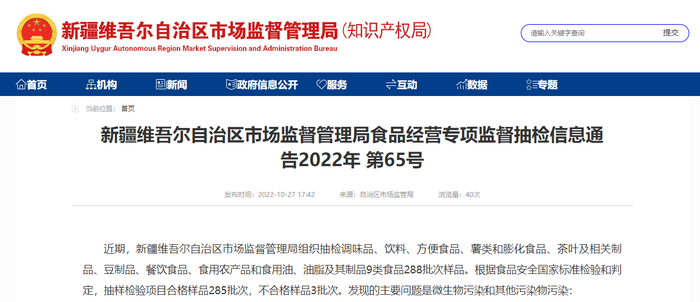 中国质量新闻网讯 2022年10月27日,新疆维吾尔自治区市场监督管理局网站发布食品经营专项监督抽检信息通告2022年 第65号。据通告,近期,新疆维吾尔自治区市场监督管理局组织抽检调味品13批次,根据食品安全国家标准检验和判定,合格12批次,不合格1批次。
