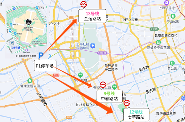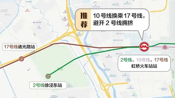 提醒:根据预测,2号线客流较拥挤,西登录厅入场排队较长,建议观众可通过10号线在虹桥火车站站换乘17号线入场。