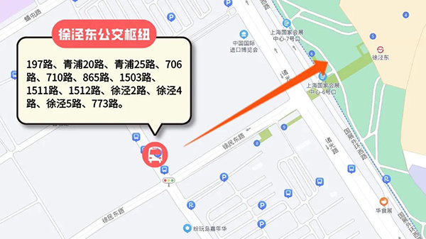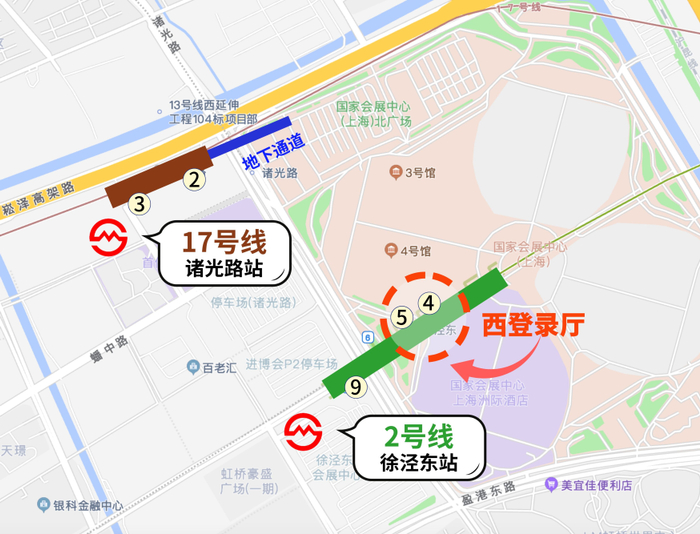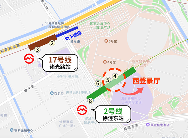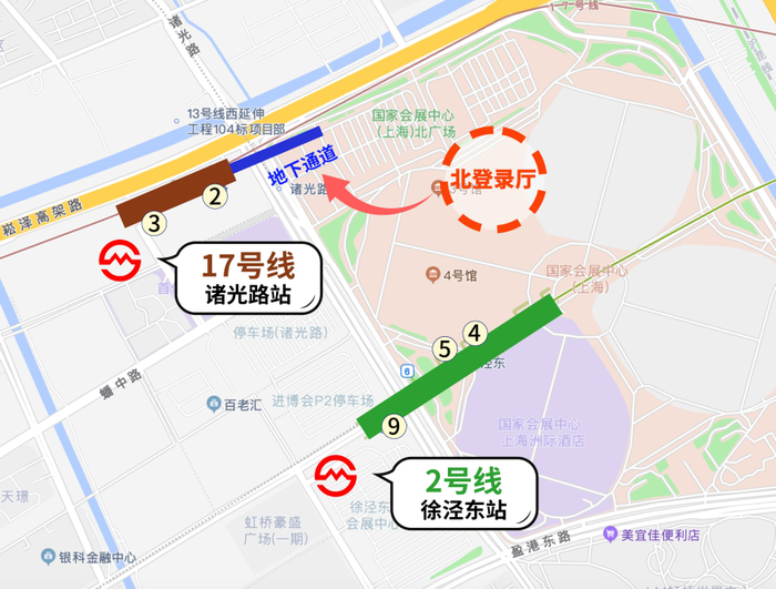 建议线路:从崧泽大道诸光路港湾式公交站点出发,经诸光路地道至北广场,前往国家会展中心北登录厅。