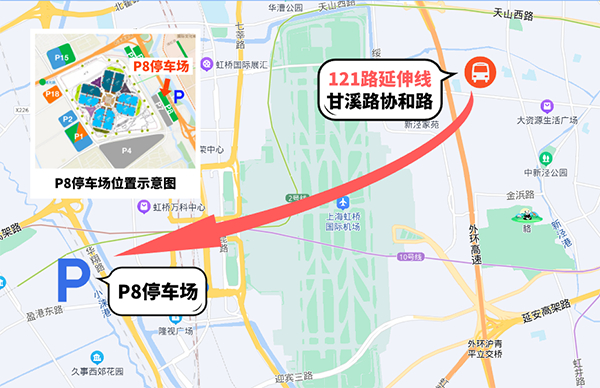 观众乘大巴、自驾小车到达停车场后,P1、P2等近端停车场可步行到馆,远端停车场可通过停车场接驳线至P5、P8后再步行抵达国家会展中心。