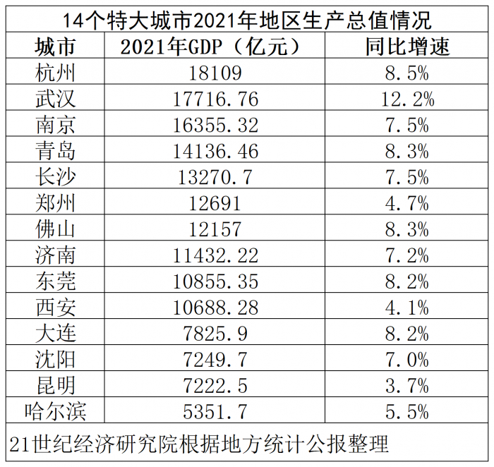 从2021年的GDP总量来看,14个特大城市中有10个已经进入万亿GDP俱乐部,分别为杭州、武汉、南京、青岛、长沙、郑州、佛山、济南、东莞、西安。