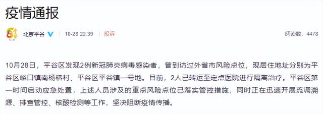 据“北京平谷”微博,10月28日,北京市平谷区发现2例新冠肺炎病毒感染者,曾到访过外省市风险点位,现居住地址分别为平谷区峪口镇南杨桥村、平谷区平谷镇一号地。目前,2人已转运至定点医院进行隔离治疗。平谷区第一时间启动应急处置,上述人员涉及的重点风险点位已落实管控措施,同时正在迅速开展流调溯源、排查管控、核酸检测等工作,坚决阻断疫情传播。