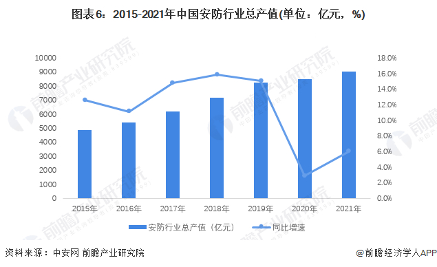 在经济快速发展、国内安防需求不断增长的背景下,我国安防市场整体发展迅速。据中安网数据,2020年我国安防行业总产值达到8510亿元,同比增长2.9%。2021年我国安防行业行业产值达到9020亿元。