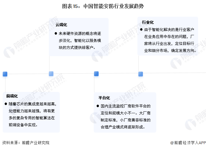 我国智能安防行业未来发展趋势主要有前端化、云端化、平台化、行业化四个方向。