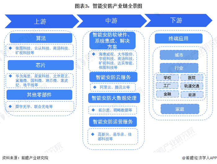 智能安防产业链涉及上游算法、芯片设计、以及存储器、图像传感器等零部件生产,中游软硬件及系统集成、或提供智能安防运营服务环节,下游主要应用于城市、家庭、以及学校、医院、轨道交通、金融等行业。