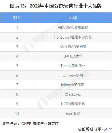CNPP依托大数据技术,综合品牌实力、产品销量、用户口碑、网友投票等近百项指标评选出的2022年智能安防十大品牌排行榜单显示,2022年,我国排名前三的智能安防品牌分别为HIKVISION海康威视、Honeywell霍尼韦尔安防和ANJUBAO安居宝。