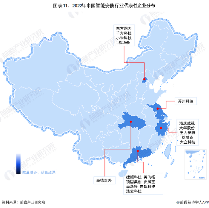 从代表性企业分布情况来看,智能安防软硬件及系统集成企业主要分布于珠三角、长三角以及北京等地区,运营服务商以广东地区居多。