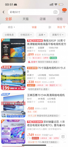 近两年来,市面上的电视尺寸越来越大,售价却并没有水涨船高。《华夏时报》记者注意到,随着双十一促销大战打响,彩电“价格战”愈演愈烈。线上电商平台上,销量最大彩电集中在55英寸至75英寸的中等尺寸,价格集中在1000至4000元左右,而部分50寸左右的电视只要几百元就能买到。
