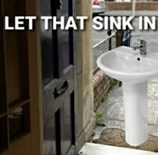 实际上,“let that sink in”是英文中一个很流行的“梗”,有中文“你细品”的意思。“sink”作为名词有“水槽”的意思,网络上经常有人发一个被放在门口的洗漱槽表情包,意思是“让那个水槽进去”(你细品)。