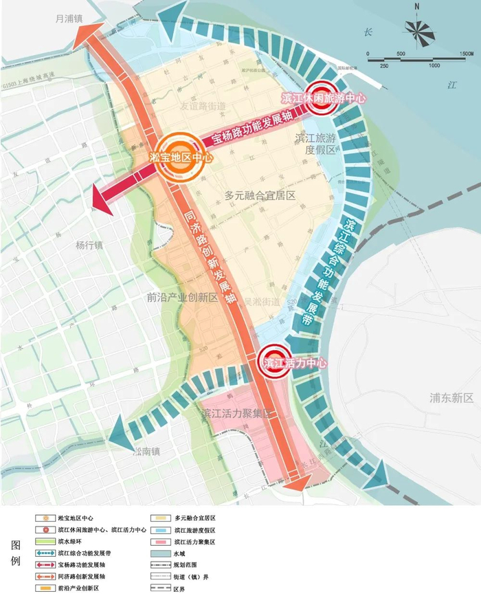 空间结构:深化区总规空间结构,规划形成“绿带环抱、三心聚力、轴带联动、四片缝合”的空间结构。“绿带环抱”为沿长江、黄浦江、蕰藻浜、南北泗塘和马路河组成的滨水绿环;“三心聚力”为淞宝地区中心、滨江活力中心、滨江休闲旅游中心联动发展;“轴带联动”为“两轴、一带”,包括宝杨路功能发展轴、同济路创新发展轴以及长江、黄浦江、蕰藻浜滨水地区构建的T形滨江综合功能发展带;“四片缝合”包括前沿产业创新区、滨江活力集聚区、滨江旅游度假区与多元融合宜居区。