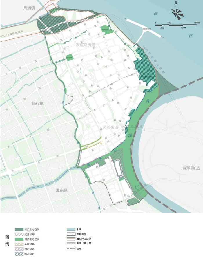 生态空间:落实宝山区总规的生态空间要求,划定生态空间总规模约4.4平方公里,规划河湖水面率11.2%。