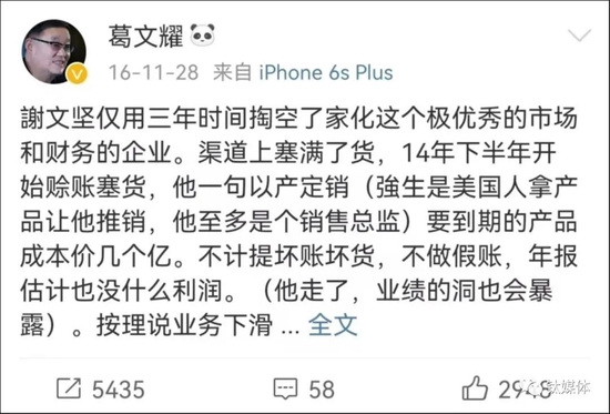 上海家化之父、前任董事长葛文耀曾在微博痛批公司“赊账塞货”、“以产定销”。