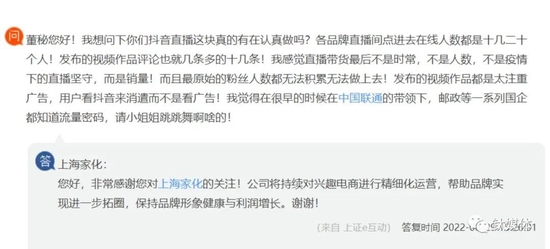 上海家化曾对外表示,公司线上渠道将继续降低对单一模式的依赖,不断提升自播业务占比和运营能力。然而,其自播业务效果似乎并不理想。不少投资者反映公司官方直播间人气不足,粉丝数量少,视频作品流量低。直播运营人员的专业能力和管理水平令人怀疑。