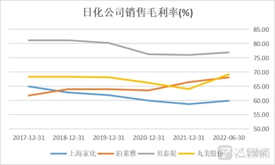 与同在A股上市的丸美股份、贝泰妮、珀莱雅相比,无论是毛利率还是净利率,上海家化都存在不小差距。