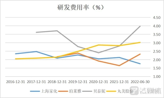 Wind数据显示,上海家化研发费用率由2012年的2.27%下降至2021年的2.13%。2022年上半年创出1.76%的历史新低。同期,珀莱雅、贝泰妮、丸美股份研发费用率分别为2.33%、3.98%、3.02%。即使在研发费用率普遍较低的国产日化美妆品牌里,上海家化依然垫底。
