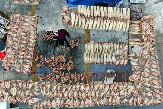天气转冷,气候干燥,眼下正是一年中最适合晒鱼的时节。在崂山区港东码头,渔民们将捕获的大头腥、偏口鱼、鳗鱼等海鱼用水清洗、去除内脏,再集中晾晒。码头俨然成为晾晒场,展示着渔民金秋的收获。(青岛日报/观海新闻记者 于滈 摄影报道)