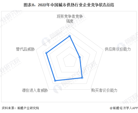 从五力竞争模型角度分析,我国城市供热在国家政策以及需求上升的推动下,行业具有较好的发展前景,对新进入者具有一定吸引力。从事城市供热的企业需要投入巨大的固定资产,同时在热力技术上也要有巨大的投入。因此,一旦企业在大量投入后想要退出行业时,也面临着较大的成本。在城市供热行业中,除“国家队”具有较强竞争能力之外,一些在新能源、传统热电领域已经耕耘多年的企业在经营模式、盈利模式以及客户保有上也有自身优势。除此之外,中小型企业在低端市场激烈厮杀。随着清洁能源的普及和技术的进步,未来替代品的威胁将会加大。