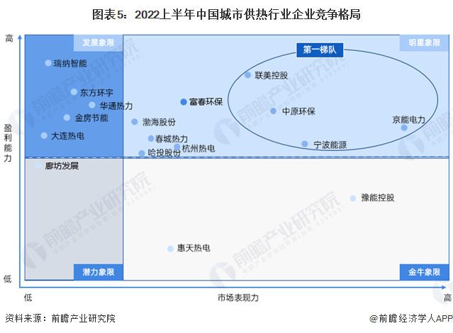 综合2022上半年企业市场表现和盈利能力分析,处于明星象限的企业有联美控股在内的9家企业,其中处于第一梯队的有联美控股、中原环保、京能电力和宁波能源;其次是富春环保、杭州热电、渤海股份;在发展表现较好的有瑞纳智能、东方环宇、华通热力等。