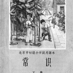 初级小学(指一年级至四年级)常识课试用课本(下册),适用于六岁至十岁的学生。这本教材的封面描绘的是同学们养护向日葵的场景:一个同学提着水往田里走,一个同学给向日葵浇水,还有两个同学在摘枯黄的叶子;向日葵的根部用土围起小土埂以便存水,葵秆上的花头都朝着同一个方向……这幅封面绘画选择了那些能激起学生兴趣的知识点,直观表明常识课的课程特点——常识课意在为学生解答那些隐藏在表面之下的“为什么”,是从现象走向学理;一个再平常不过的养护植物的场景,其中蕴含的科普知识着实不少。