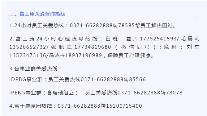 富士康员工如有困难、诉求,可以拨打关爱热线。