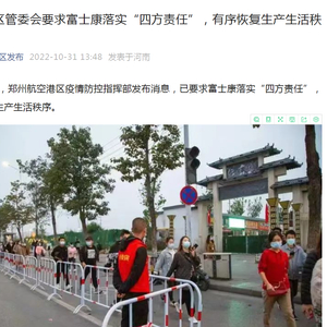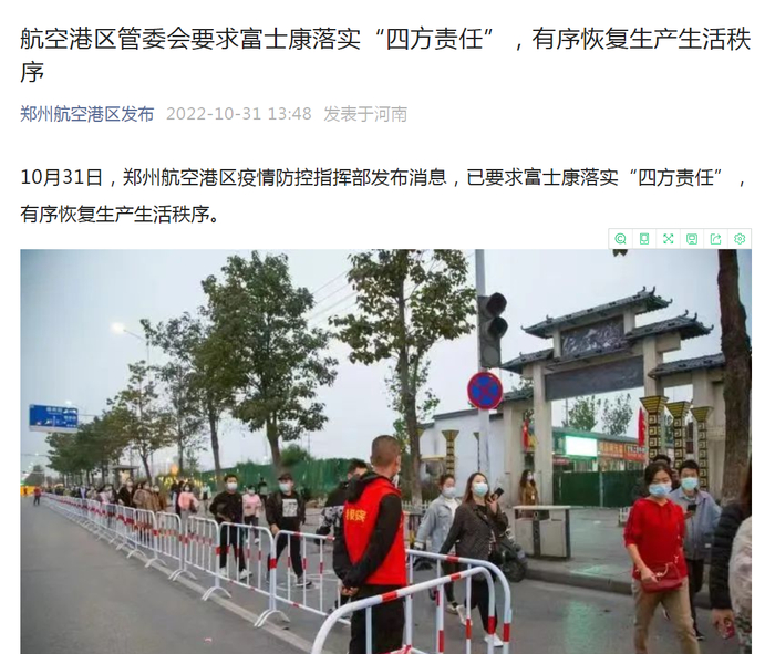 10月31日,郑州航空港区疫情防控指挥部发布消息,已要求富士康落实“四方责任”,有序恢复生产生活秩序。