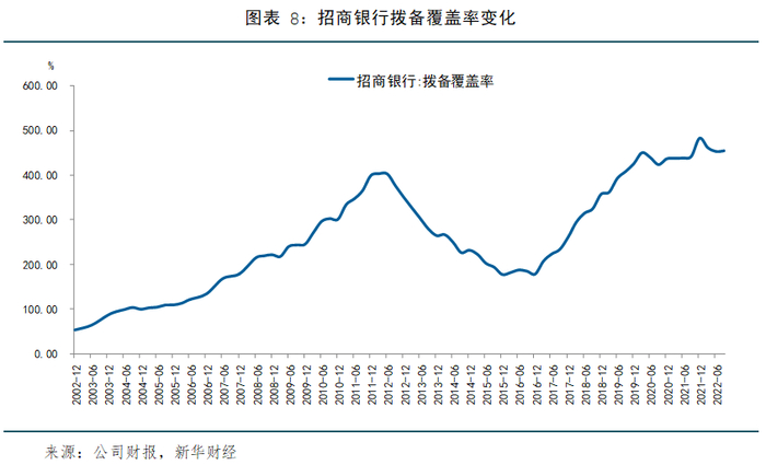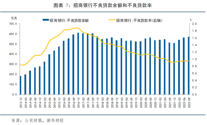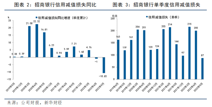 信用减值损失同比下降11%,拨备反哺利润。前三季度,招商银行信用减值损失501.67亿元,同比下降10.85%,与上半年相比,降幅扩大。上一次招商银行信用减值损失负增长出现在2018年上半年。单独看2022年第三季度,信用减值损失为86.69亿元,回到多年来的低位,同比减少40%。