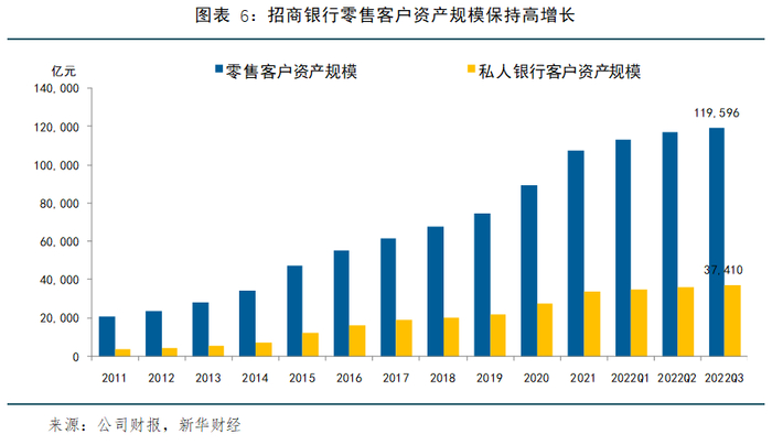 AUM及客户基础保持良好增长。三季度末,招商银行管理零售客户总资产(AUM)余额11.96万亿元,逼近12万亿元,较上年末增长11.16%,保持高增长态势。其他客群及资产规模指标也保持增长。零售客户数1.82亿户(含借记卡和信用卡客户),较上年末增长5.20%。金葵花及以上客户409.45万户,较上年末增长11.51%;管理金葵花及以上客户总资产余额97603.88亿元,较上年末增长10.46%。私人银行客户133388户,较上年末增长9.28%;管理私人银行客户总资产余额37409.85亿元,较上年末增长10.23%。