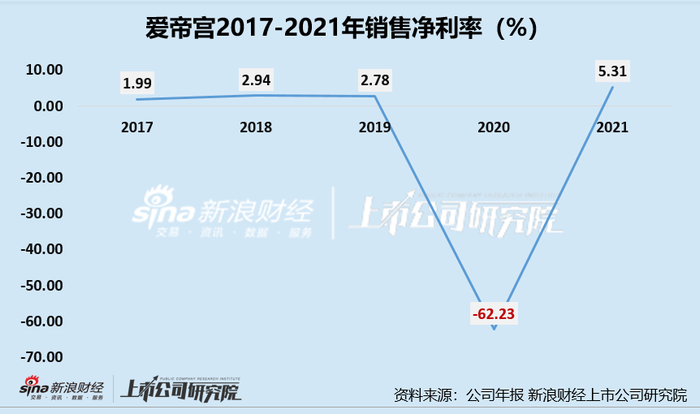 2019年-2021年,爱帝宫的营业收入分别为5.47亿元、5.06亿元、5.25亿元,母公司综合收益总额分别为700.05万元、-27570.11万元、1990.69万元,销售净利率分别为2.78%、-62.23%、5.31%,常年在盈亏平衡线上下徘徊。