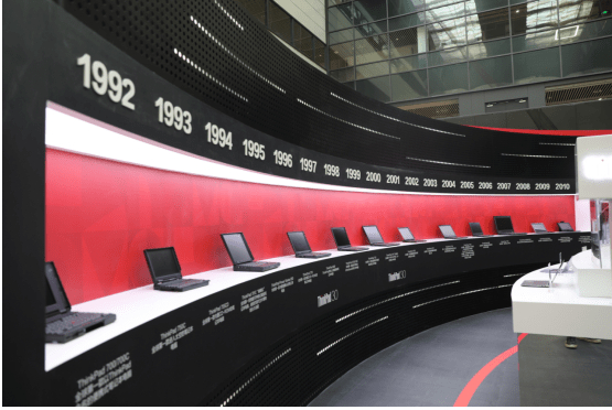 展区通过同心圆的设计,由外至内层层递进,以时间为线索,呈现出Think品牌从过去经典机型到现今丰富产品线组成的ThinkFamily,比如ThinkPad旗下商务旗舰笔记本电脑;ThinkSystem旗下的服务器矩阵;接连刷新运算极限的ThinkStation工作站家族;以及定位新青年群体的ThinkBook系列机型、高端商用显示器ThinkVision、ThinkSmart-IoT智能物联产品等。最终,在展区中心,汇聚成代表Think未来无限可能的小红点