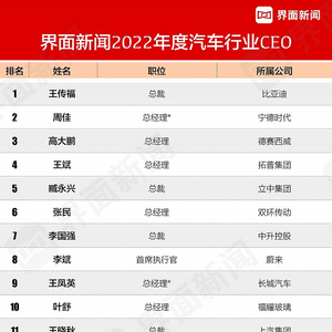 2022年度汽车行业CEO榜单:比亚迪董事长兼总裁王传福位居榜首