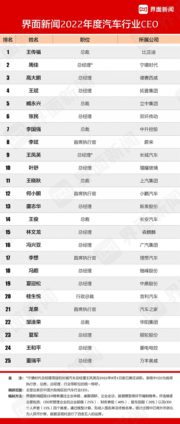 本篇中CEO为首席执行官、总裁、总经理、行业等职位的统一称呼。该榜单研究面向中国地区汽车行业CEO。界面新闻超级CEO榜单通过企业申报、桌面调研、企业走访、数据模型等环节编制榜单。评选维度主要包括:CEO所管理企业的企业规模(25%)、财务表现(40%)、股东回报(20%)以及CEO个人声誉(15%)四个维度。通过模型估算,形成入围名单及终榜名单。统计过程中已将外币转化为人民币计算,数据呈现时进行了四舍五入的运算。