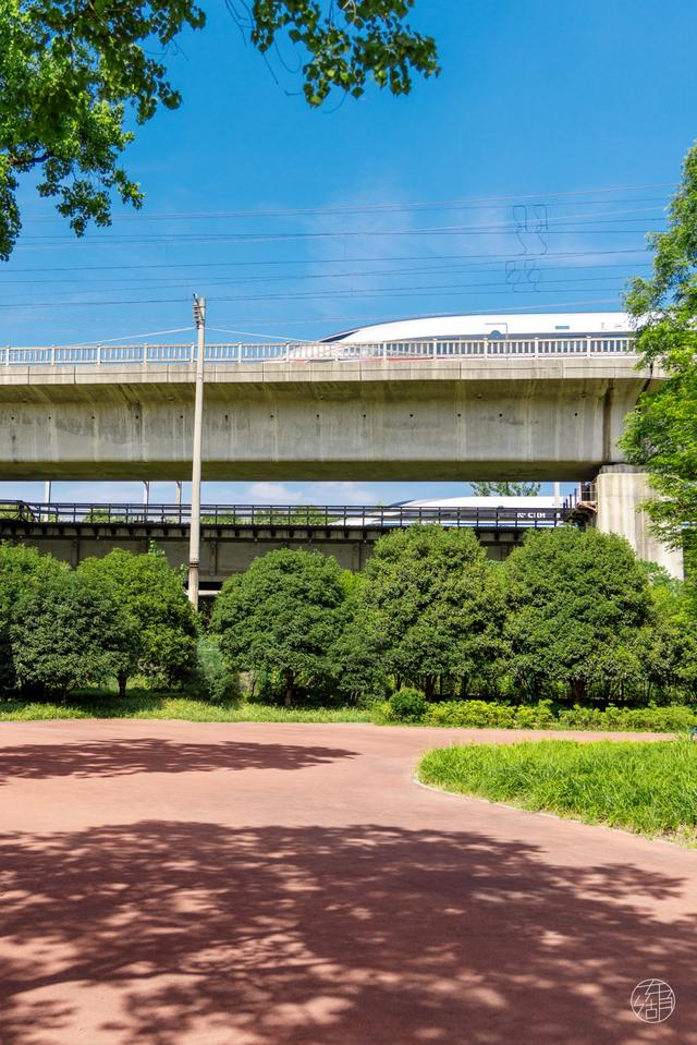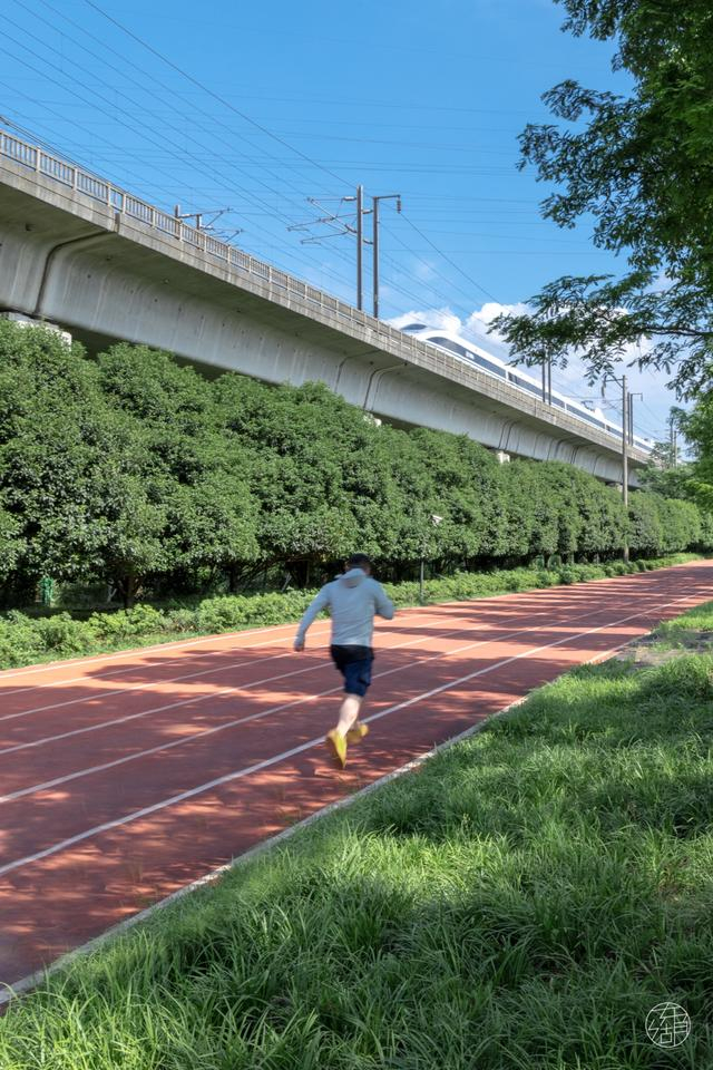 「高铁竞跑」这条百米专业跑道是专为短跑训练所建,跑道与高铁并行,每隔几分钟便有高铁经过。