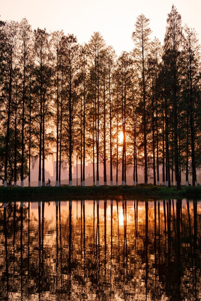 夕阳为杉树镀上金光,池塘的倒影显露对称的美感,有人骑车经过,给整个画面添上一份动感。