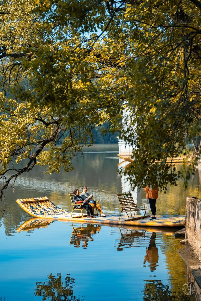 湖面就像一面镜子,反射出秋天的绚烂,借助植物的枝叶当作前景,镜头里的一切都变得悠远。