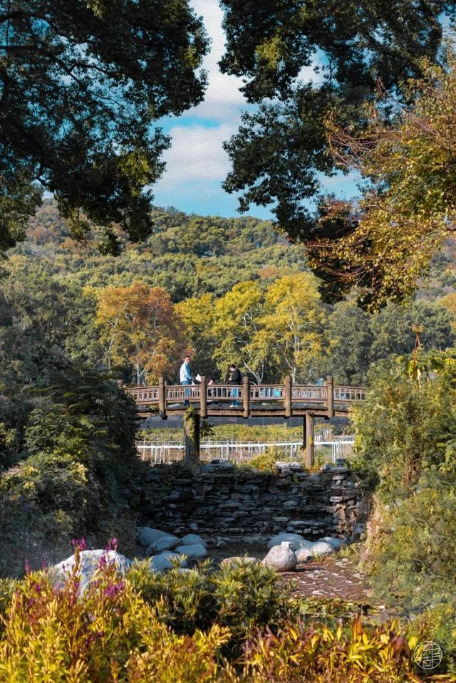 本草园里的小喷泉,正对着园内的木桥,桥后是磨山层层的秋色,加之自然缤纷的色彩,让人分不清是现实还是在画中。