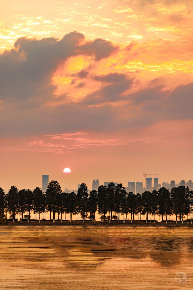 站在磨山沿线绿道的斜坡上,给湖水留出更多空间,找一处路灯,给整个画面一些跳跃感。