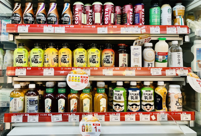 在北京便利蜂,暖饮柜分为三层,上下层分别以咖啡和茶饮为主,中层则以果汁、牛奶产品为主。货架排面上,旭日森林暖饮、Costa咖啡、雀巢咖啡、农夫山泉东方树叶、元气森林乳茶占据货架的前五大饮品。而全家便利的暖饮柜是一个放在收银机旁边的4层迷你柜子,在咖啡、茶饮之外,增加了植物奶、椰汁、燕麦摩卡等更迎合年轻消费潮流的产品。