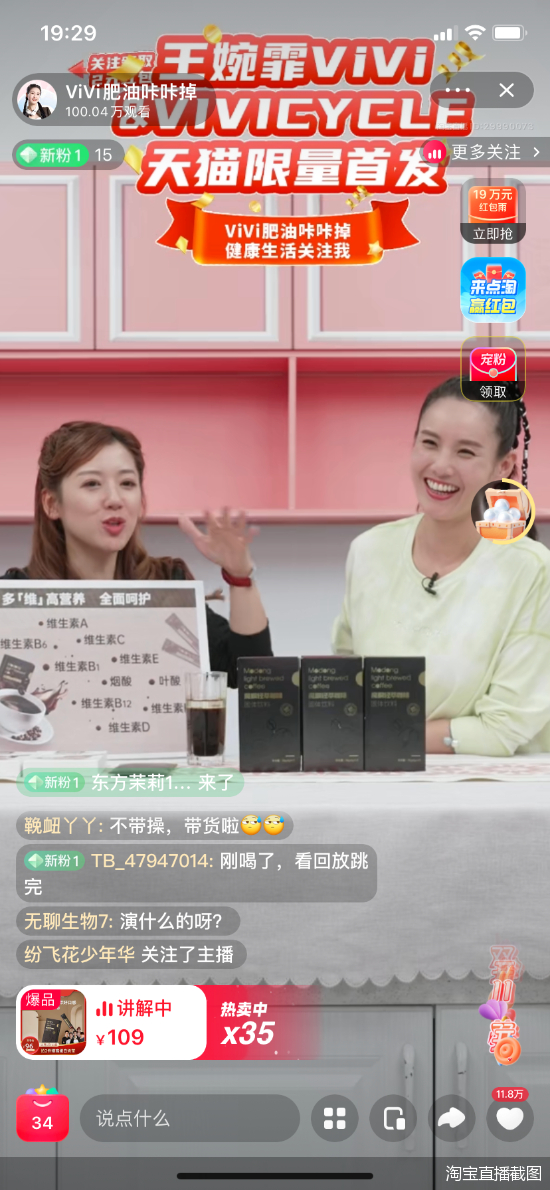 10月31日晚间7点,刘畊宏妻子王婉霏ViVi现身“ViVi肥油咔咔掉”淘宝直播间向粉丝介绍团队和商品。北京商报记者看到,直播间上架的商品链接共34个,包括健身服饰、健身食品和用具。在ViVi讲解半小时之后,直播间场观达到100万人次。据了解,在11月9日,刘畊宏将与ViVi一起在淘宝直播。
