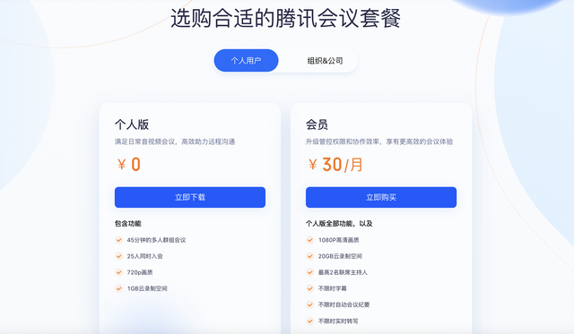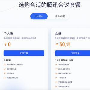 目前腾讯会议对个人用户推出会员套餐包括,连续包月25元/月、连续包年288元/年、3个月88元和1个月30元。同时,对组织或公司,推出个人设备商业版每年4788元起,以及企业版和会议室解决方案每年1200元起。
